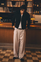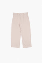 A tailored trouser with a streetwear sensibility. Designed with a low rise, meant to be worn lower on the hips for a relaxed silhouette. Cropped in length with subtle pleating and a wide leg that drapes fluidly.